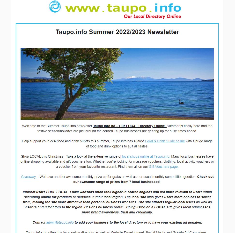 Welcome to the Summer Taupo.info newsletter Taupo.info ltd – Our LOCAL Directory Online. Summer is finally here and the festive season/holidays are just around the corner! Taupo businesses are gearing up for busy times ahead.