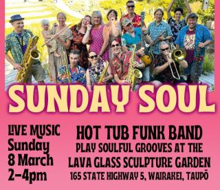Taupō’s own soul-funk favourites, Hot Tub Funk Band, return for a laid-back Sunday afternoon of music at the Lava Glass Sculpture Garden in Wairakei. Set among the stunning garden landscape on State Highway 5, this summer show is the perfect way to unwind and enjoy the sunshine.